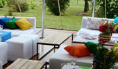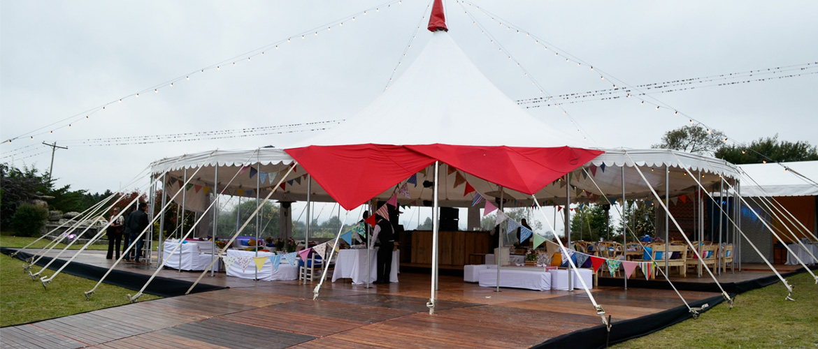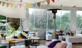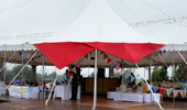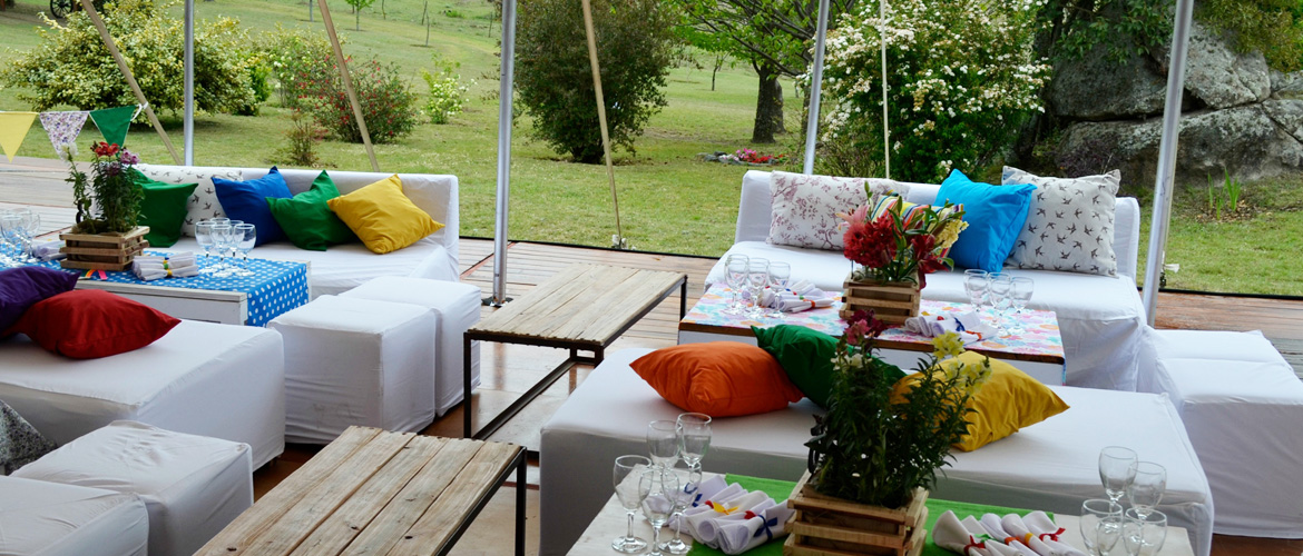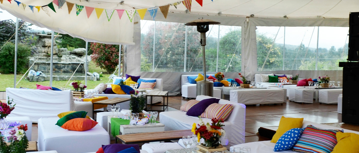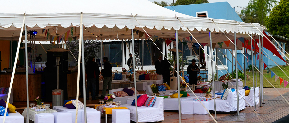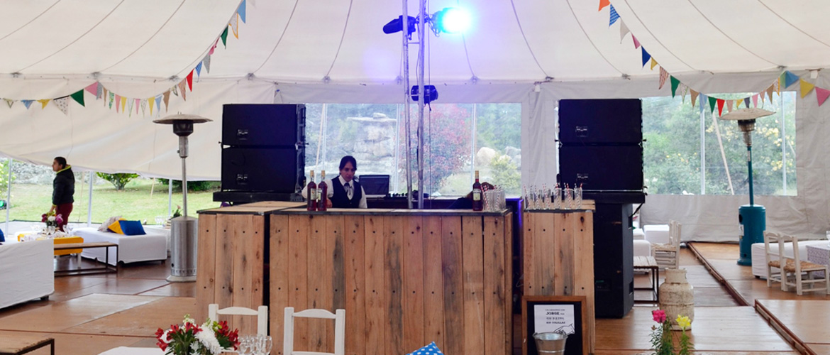 Carpa de circo color blanco de 22 m de diámetro / 390m2, piso para carpa y deck exterior, carpa para ceremonia civil, carpa para cocina, baño Premium Room, carpa para baño, marquesina de conexión carpa principal/baño, juegos de living para 250 personas con ambientación y decoración.